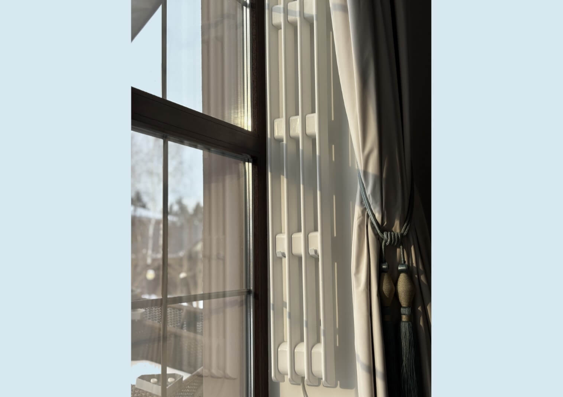 Горизонтальная ориентация используется в проектах, где требуется размещение отопительного прибора под окнами, вдоль протяжённых стен, в нишах или в зонах с ограниченной высотой установки.