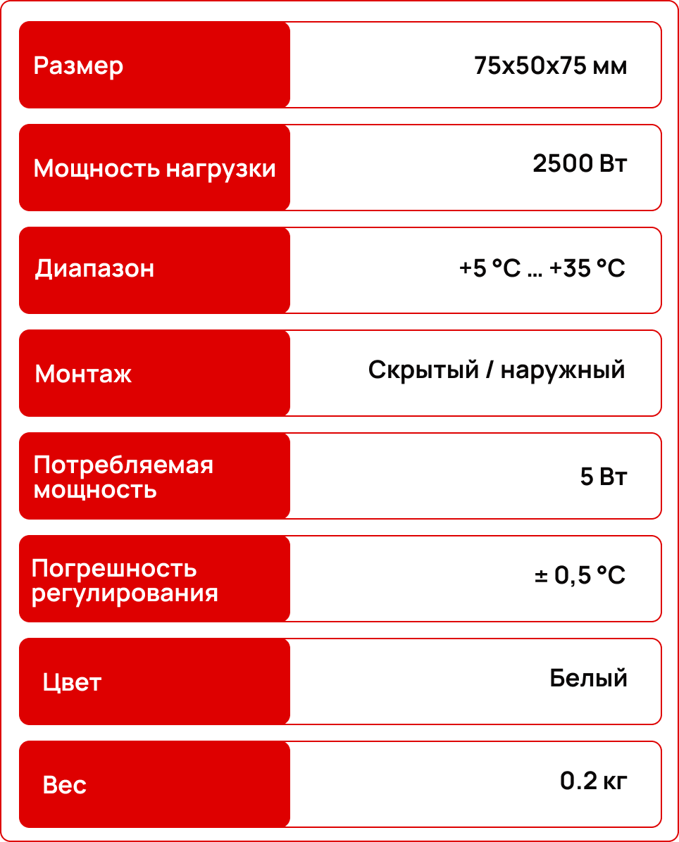 датчиком температуры пола и поддерживает подключение наружного температурного датчика. Длина кабеля датчика пола составляет 3 метра, сопротивление — 10 кОм, что обеспечивает точное измерение температуры и корректную работу системы отопления.